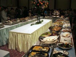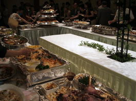 隣の会場で立食パーティがありました。 食べ物の種類は豊富。ボリュームもありました。 デザートもムースやババロア、フルーツもいっぱいありました。 飲物は、ウーロン茶・オレンジジュース。コーヒーはなし。 事前に出欠を確認しているだけに、量・質ともに計算通りだったようです。