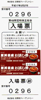9861 吉野家ディー・アンド・シー 株主総会情報 平成17年5月27日(金)10時〜 東京都新宿区 ヨテル海洋 夕刊マダムの悠々優待生活♪の 夕刊マダム様からの情報 大久保のホテルにて 9時から受付10時開始。 受付後ドリンクサービスあり。 投資相談などのコーナーあり。