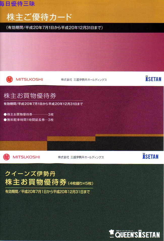 | 164 | 3-114 | 8238 | 伊勢丹● | 3.9 | 100 | ★上場廃止のため、総会無し 現金合計3,150円以上10%割引(※割引除外品目を除く) <株主ご優待クーポン券>1冊 イートパラダイス、理容室、美容室、写真室、貸衣装、洗車コーナーにおける現金3,150円以上のご利用を10%割引(割引除外品目を除く)、駐車場の無料駐車時間1時間延長)